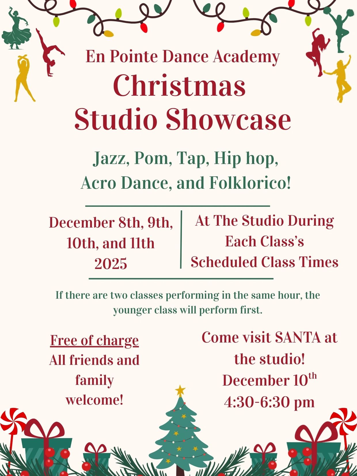 Specially choreographed Christmas dances performed at our studio to showcase dancer's progress and enjoy learning and performing a Christmas themed dance. This is for all dance classes not performing in The Nutcracker- Jazz, Lyrical, Pom, Tap, Hip hop, Acro Dance and Ballet Folklorico. Performances will be casual and during their normally scheduled class times DURING THE WEEK OF DECEMBER 8 -11. All performances will be in our Studio 2 room. Ballet classes performing in The Nutcracker will have regular classes held at their regular times this week with their performances in The Nutcracker on December 13th at Tydings Auditorium.